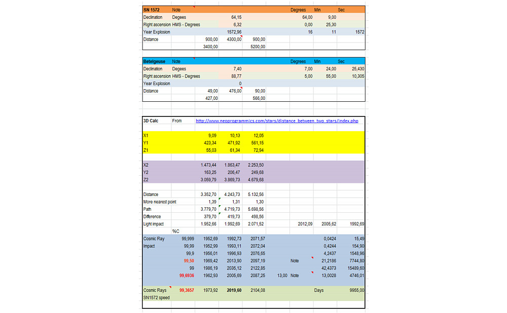 Alla fine posso tirare le somme i dati del calcolo dell'incrocio dei raggi cosmici di SN 1572 con Betelgeuse corrispondono al 100% e quindi posso dire con certezza che il calo di luminosità della stella nel 2019-2020 fu causato proprio da raggi cosmici. Sicuramente tutti i miei calcoli possono essere ricontrollati in modo più preciso per chi volesse c'è a disposizione il foglio di Excel.